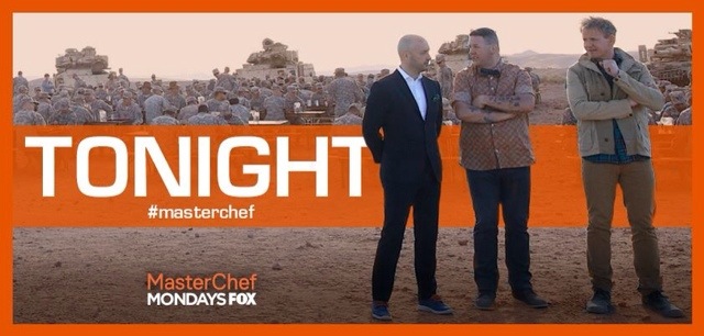 “It’s the ultimate culinary war when the remaining 20 home cooks compete in the biggest field challenge in MASTERCHEF history: feeding an army of 500 servicemen and women on a desert army base. In their first team challenge, the contestants will split into two teams – the red team and the blue team – to create a hearty meal including one protein and two side dishes. Tempers flare as both teams struggle with consistency, and every dish counts as the troops will vote for their favorite dish and determine the winning team. Later, the losing team will face an intense pressure test featuring the all-American classic, blueberry pie. Find out whose dessert will prove to be a victory and who will be sent home in the all-new Top 20.”