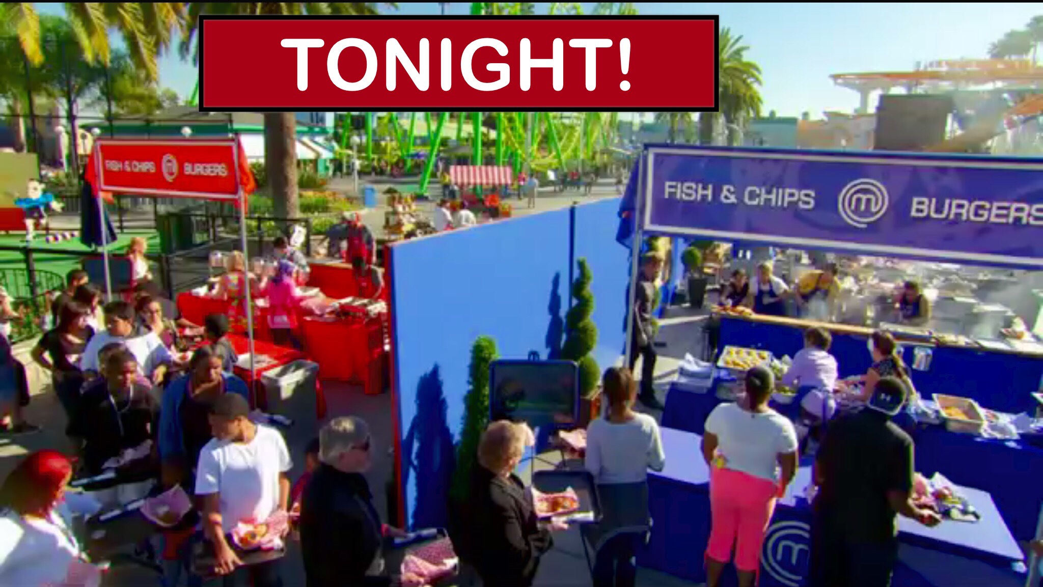 This week, the cooks visit Knotts’s Berry Farm and compete to prepare the best crab dish with the winner gaining a significant advantage before the elimination. Also the cooks must create versions of dishes using corn. Mmm. I love corn but the crab? Not so much. Let’s see if they can covert me, huh? and and cook Fish and Chips and Hamburgers. Sorry for the Mix – Up. Then, attack Cinnamon Buns. Yes, attack!