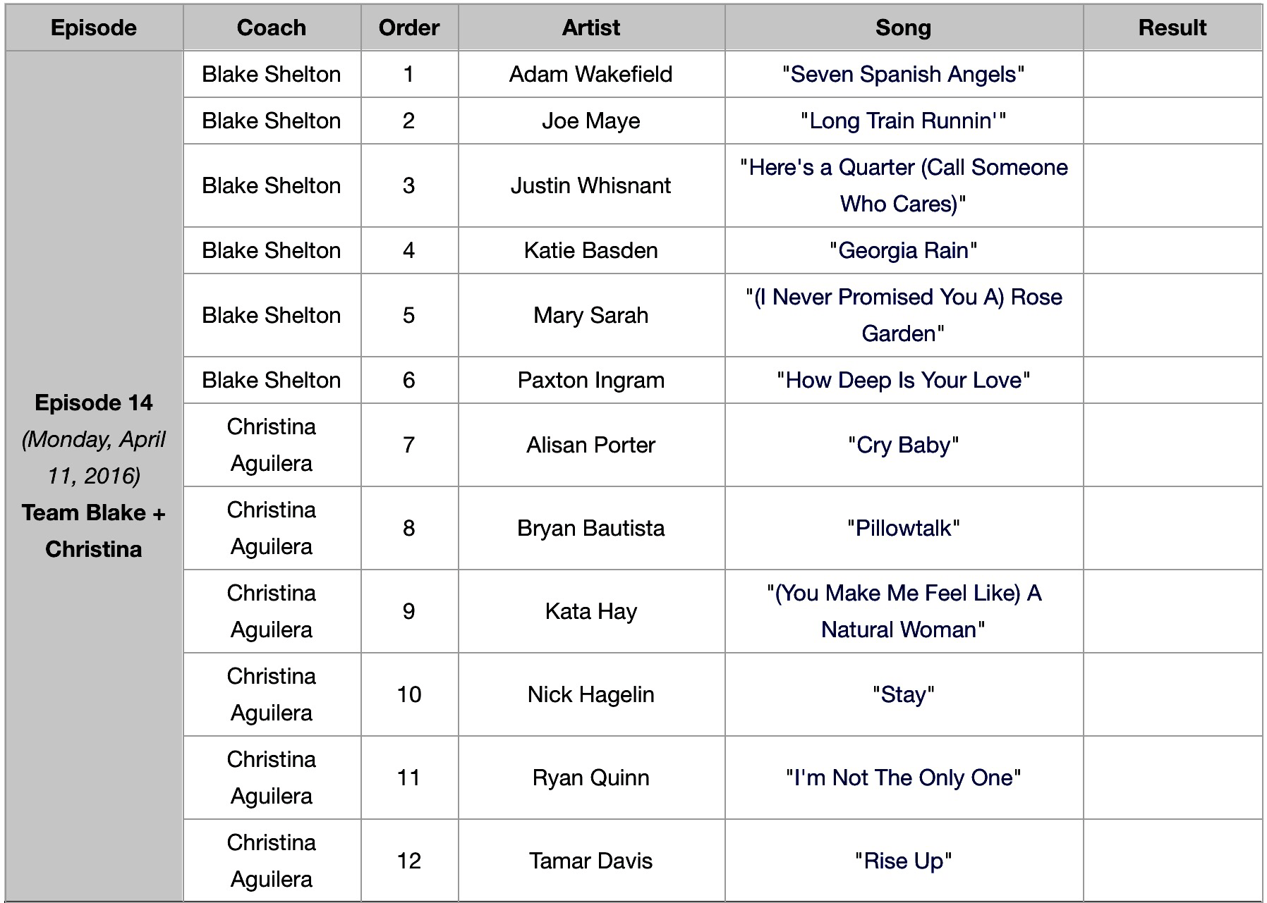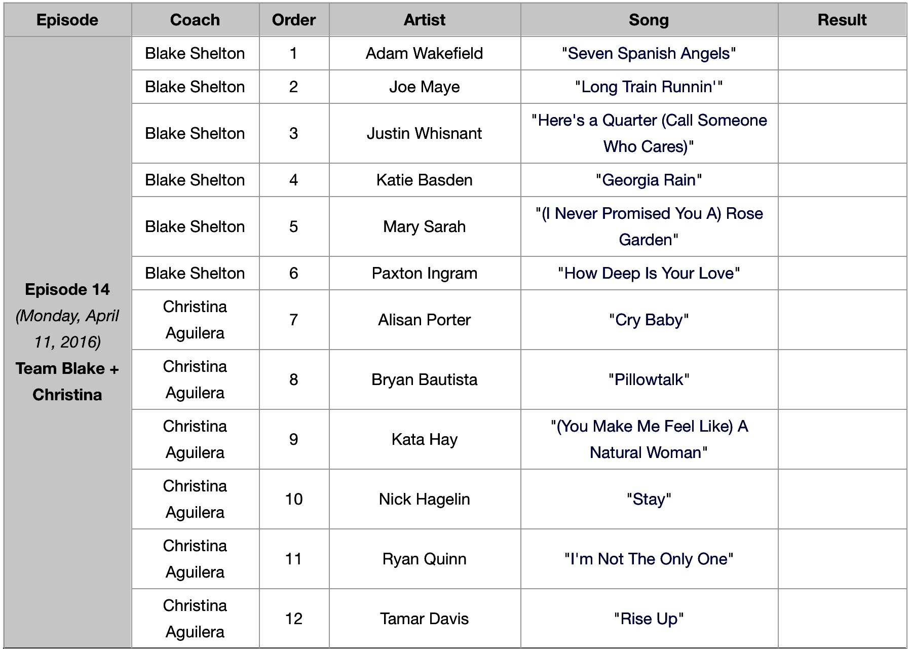Team Blake: I like them all, but if I had to choose three, it would be Mary Sarah, Adam, and Joe!