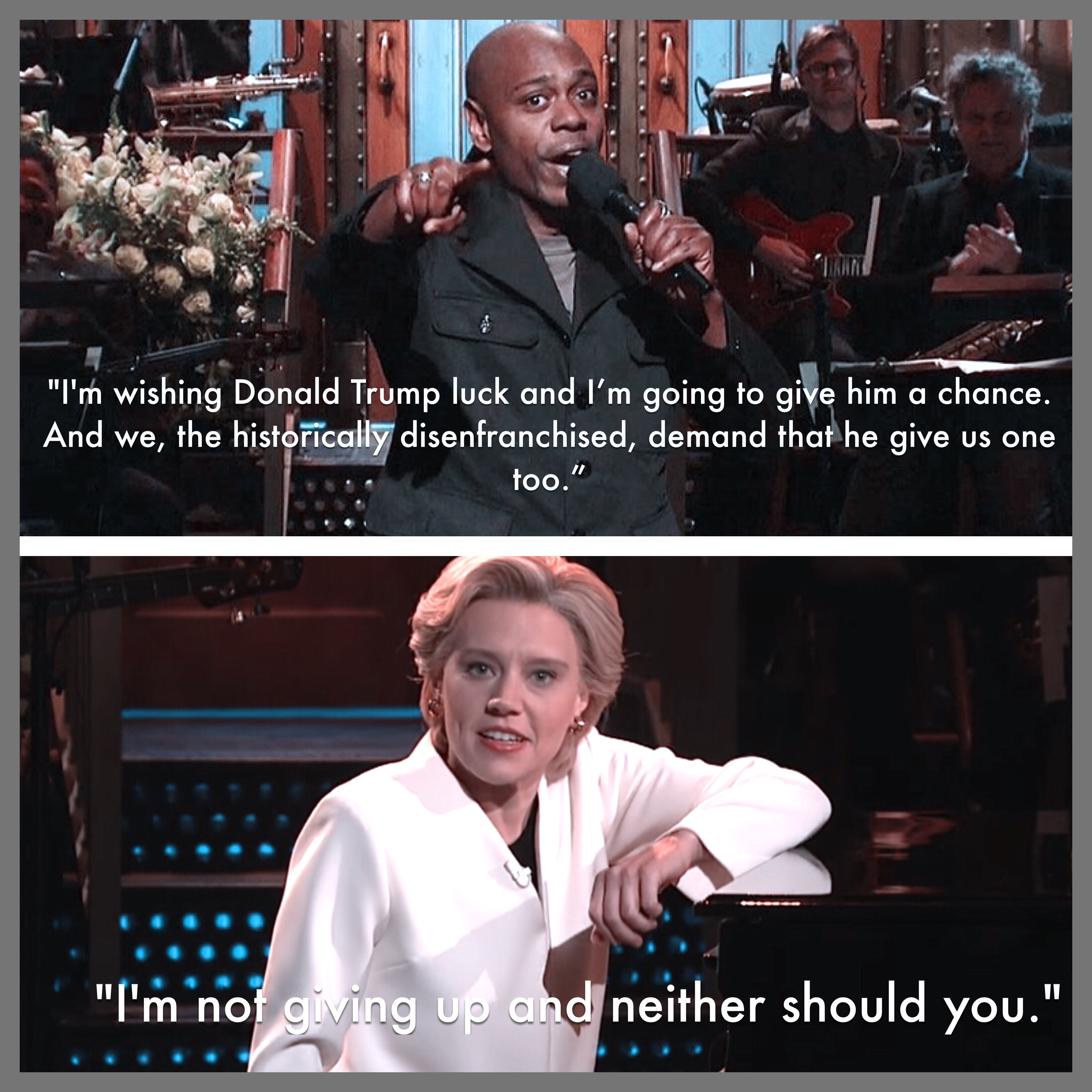 And then out popped comedian Dave Chappelle who mixed some humour with a more sober approach in addressing the election of Donald Trump as President. Just as Kate McKinnon’s song struck a chord, so did Dave Chappelle’s words.
